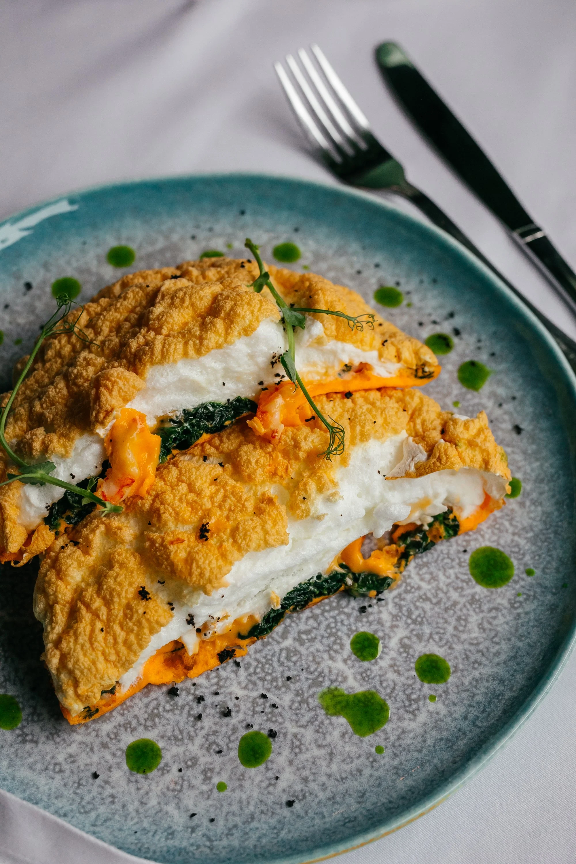 ШАГ 5 Вынуть омлет из сковороды, аккуратно разрезать его на части. Украсить микрозеленью и зеленым маслом.