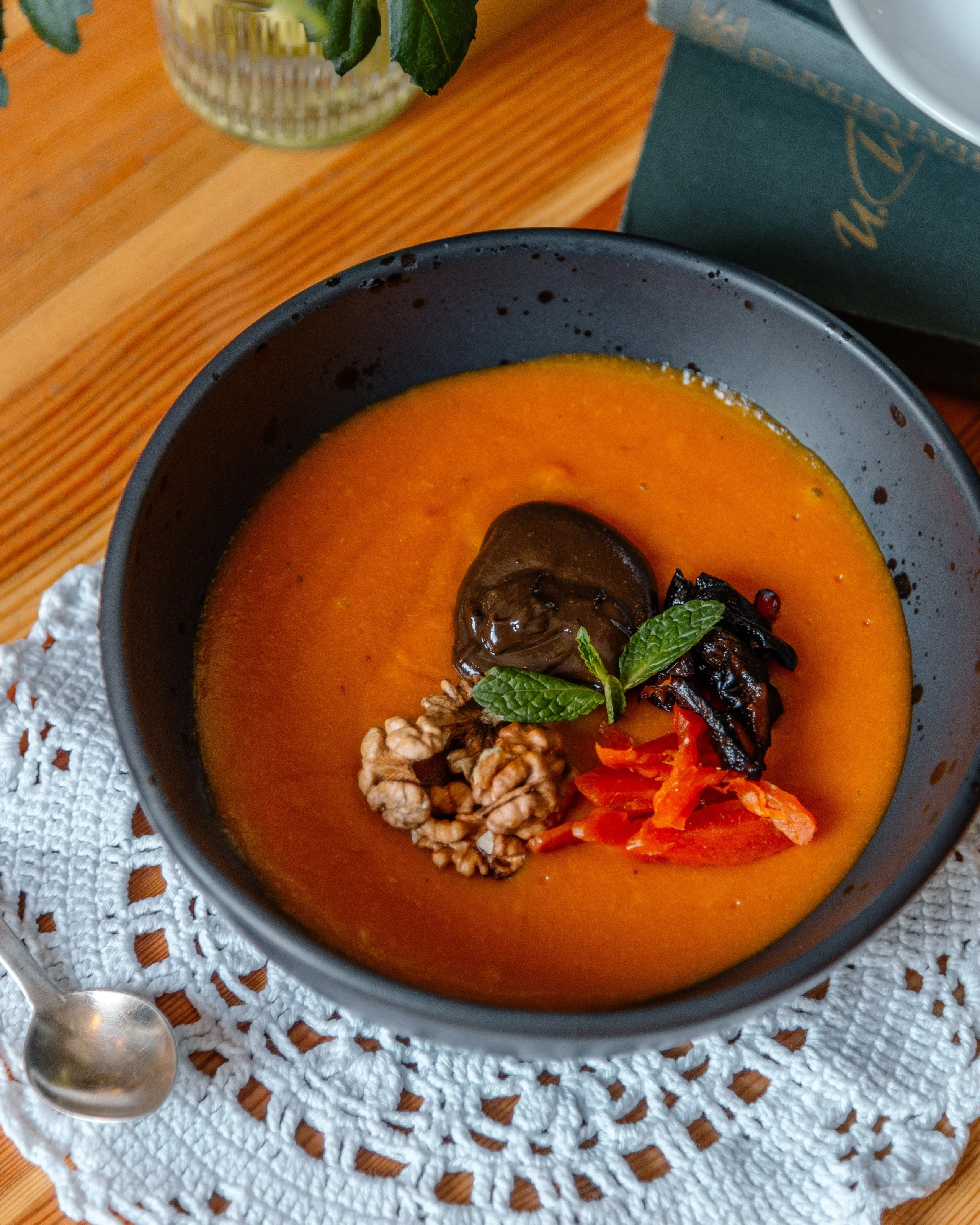 ШАГ 5 Подавать абрикосовую кашу в глубокой тарелке, предварительно сдобрив ее ложкой урбеча, сухофруктами, лепестками миндаля и украсив веточкой мяты.