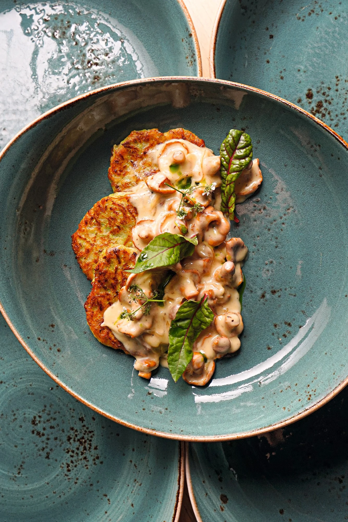 ШАГ 5 Для подачи оладьи выложить на тарелку и полить соусом из лисичек.