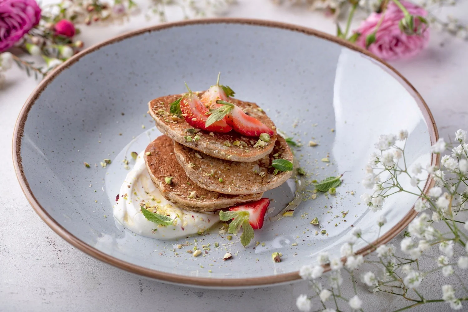 ШАГ 3 На тарелку выложить сметану. Готовые оладьи выложить рядом и полить медом, украсить клубникой, посыпать рублеными фисташками и листиками мяты.