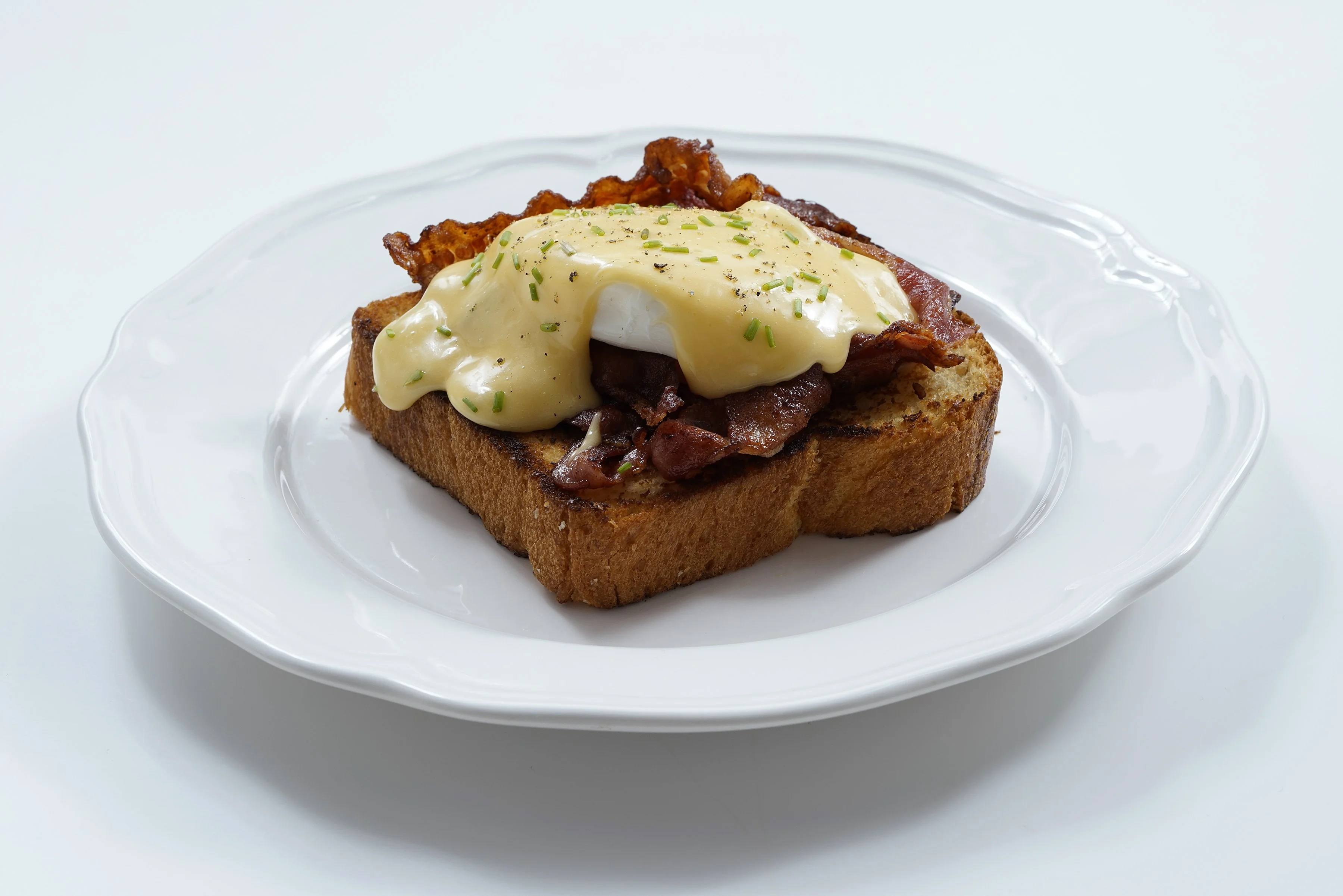 Куриное яйцо Бриошь Бекон Сливочное масло Яичный желток Белый винный уксус Лук-сибулет Соль Молотый черный перец главная Завтраки Американская кухня Пошаговые рецепты