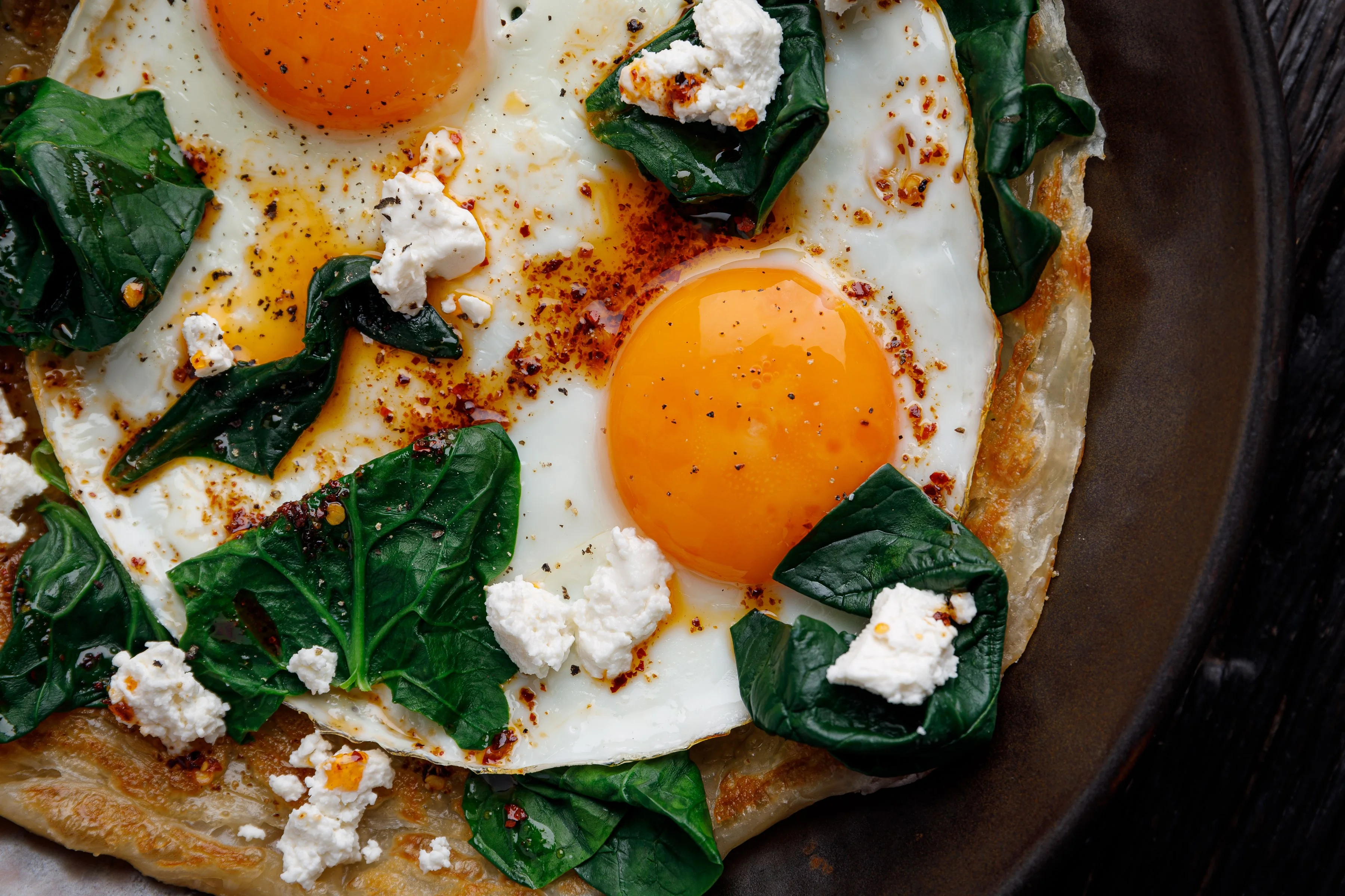 Слоеная лепешка роти с глазуньей, сыром фета, припущенным шпинатом и острым маслом