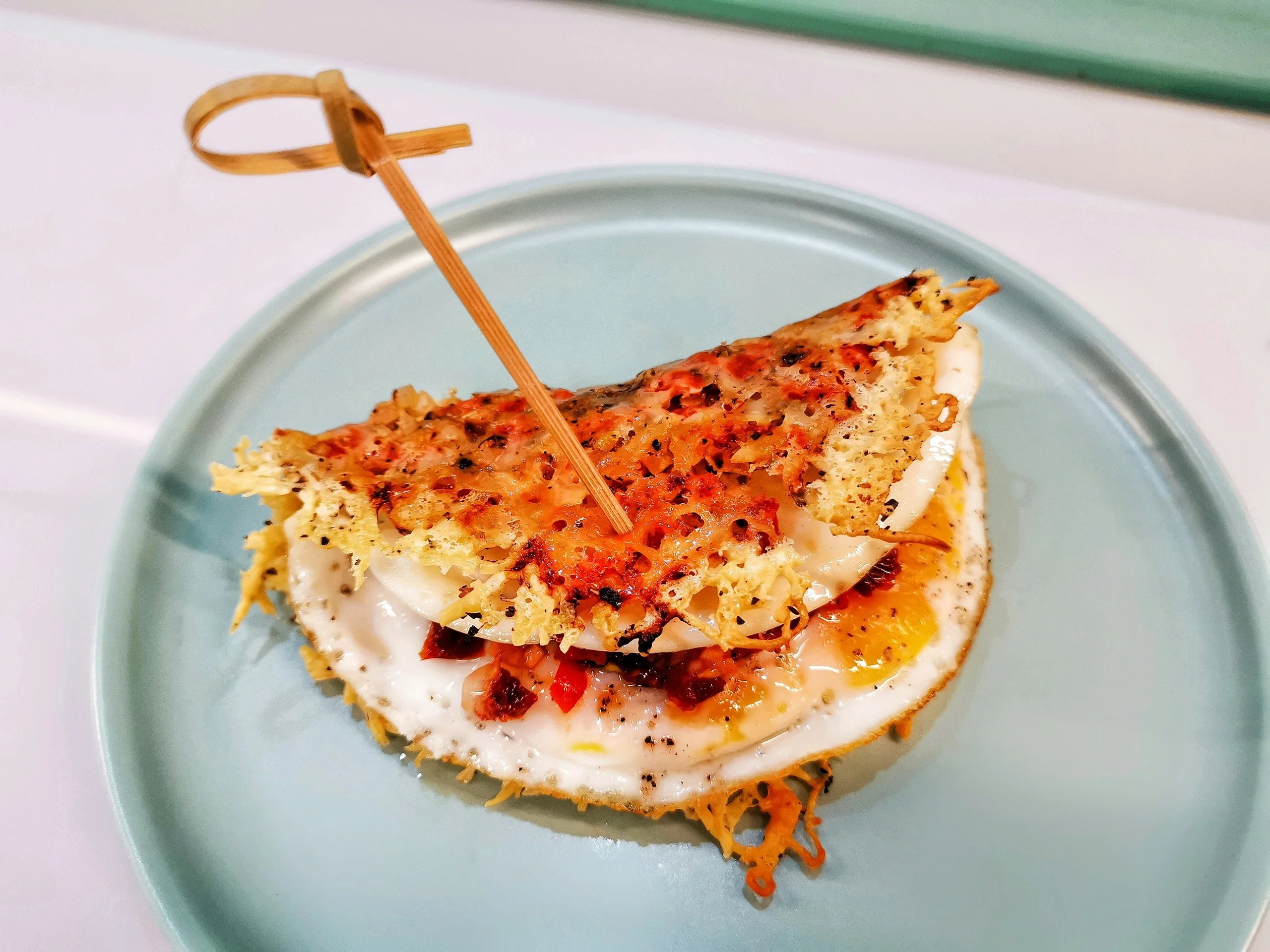 ШАГ 10 Яйцо пожарить на оливковом масле с щепоткой перца до схватывания белка.