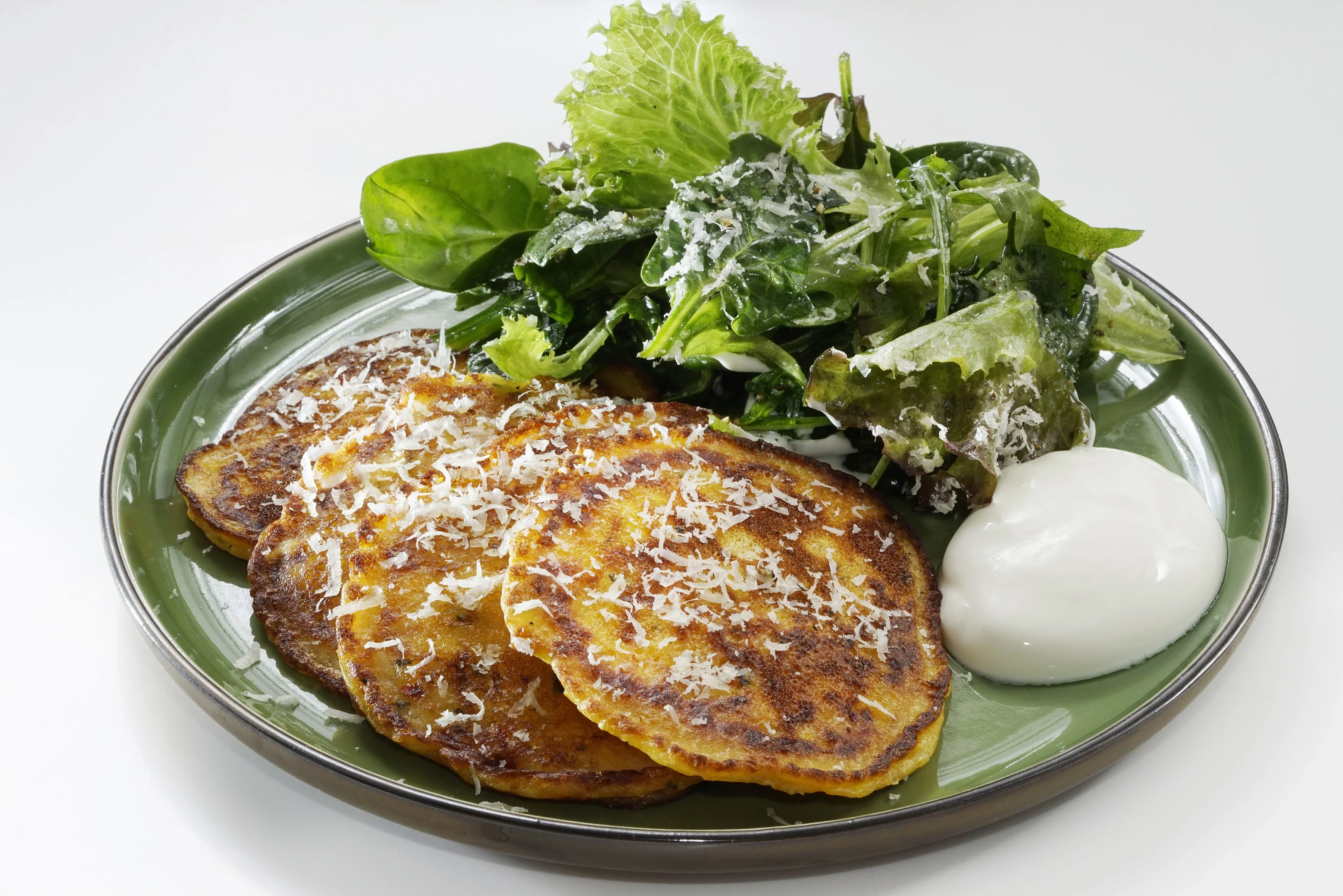 ШАГ 10 Выложить оладьи на тарелки, сверху выложить микс-салат и присыпать сыром. Подавать с йогуртом или сметаной.