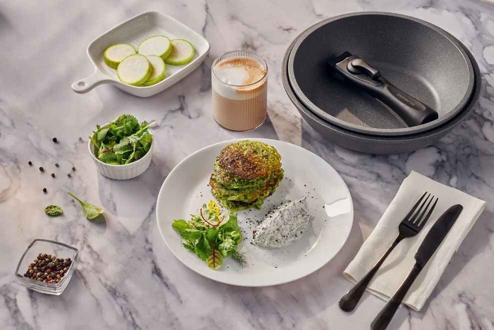 ШАГ 9 На тарелку выложить оладьи из кабачков и сметанный крем.