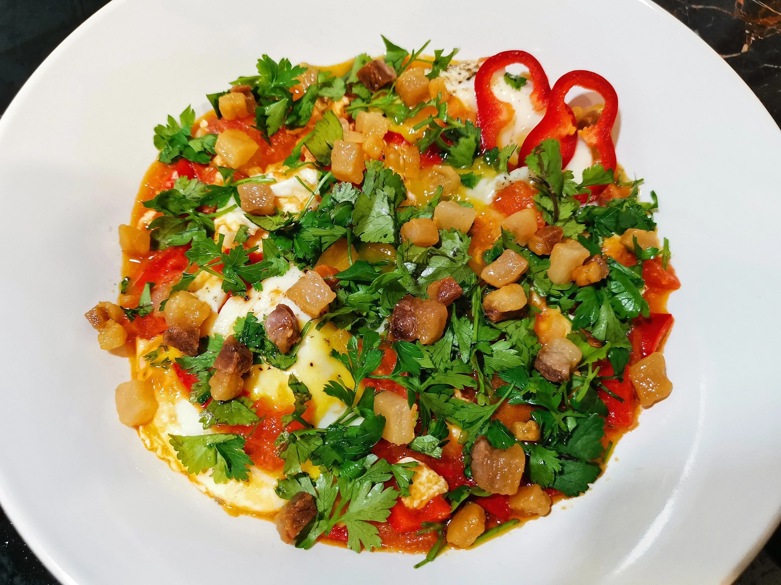 Ингредиенты для приготовления Яичница с салом и овощами: