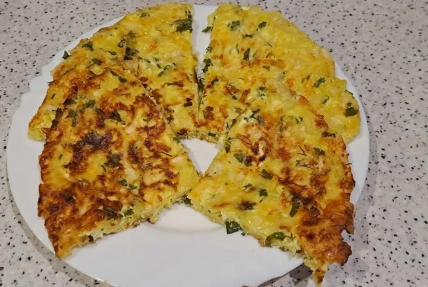 Ленивый завтрак из творога, лаваша, яиц, зелени и твердого сыра