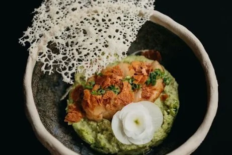 ШАГ 16 В центр тарелки выложить пюре из эдамамэ, разровнять ложкой.