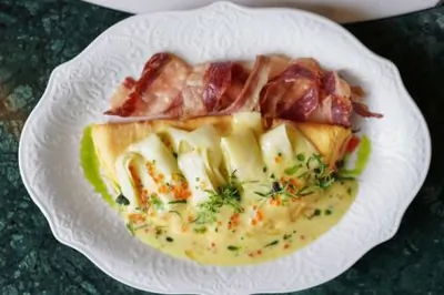 ШАГ 9 Готовый омлет выложить на тарелку, сверху разместить спаржу и полить соусом.