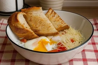 ШАГ 9 Посыпьте, получившиеся блюдо, сыром. Добавьте помидоры черри и обжаренный хлеб.
