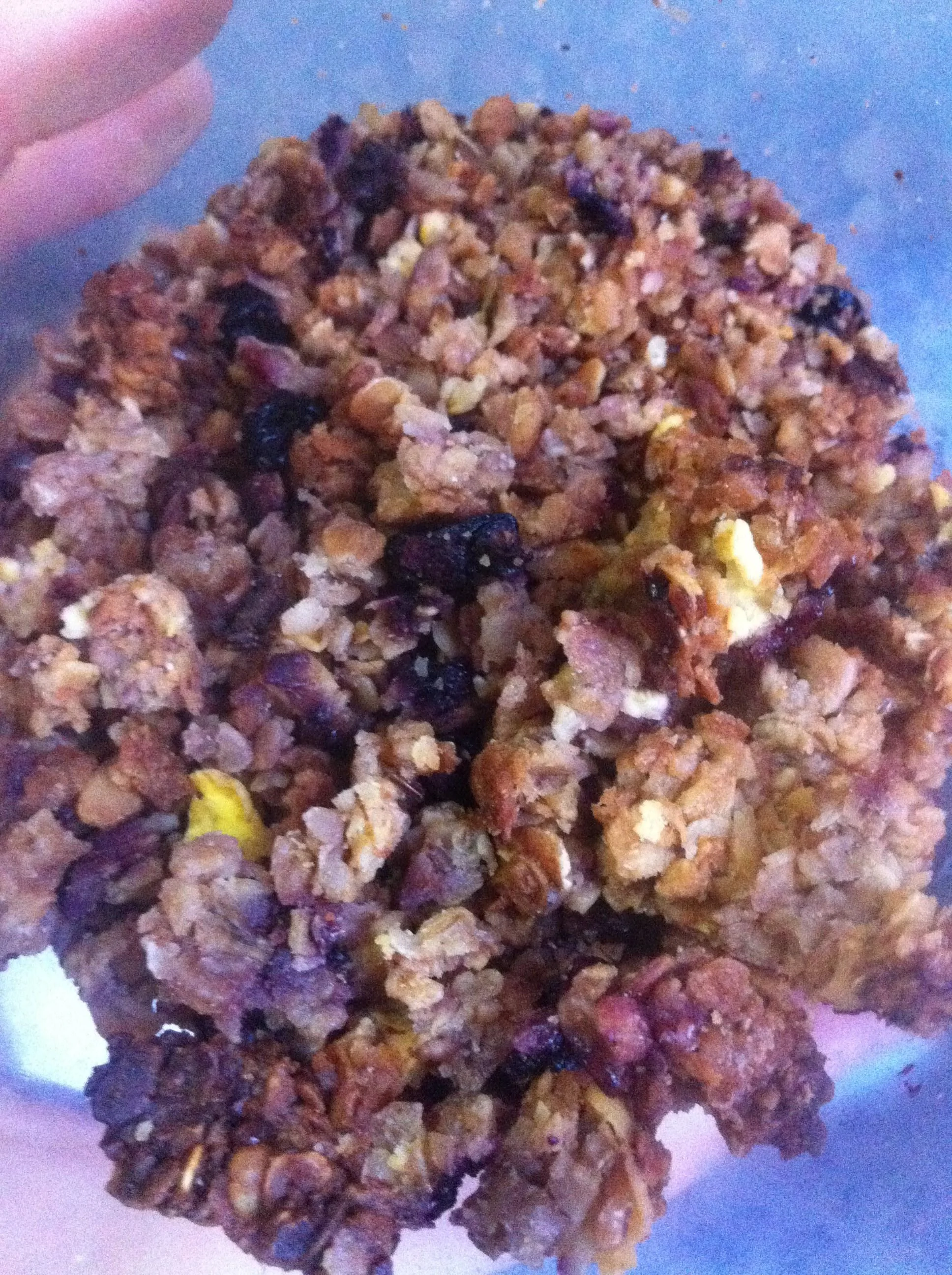 ШАГ 2 Уменьшите температуру в духовке до 150 градусов. Выложите геркулес на 2 противня. В небольшой миске смешайте размягченное сливочное масло, мед и соль. Сбрызните медовой смесью геркулес и слегка перемешайте. Разровняйте одним слоем и поставьте в духовку на 30 минут, один раз перемешав. Геркулес должен стать золотистым и хрустящим.