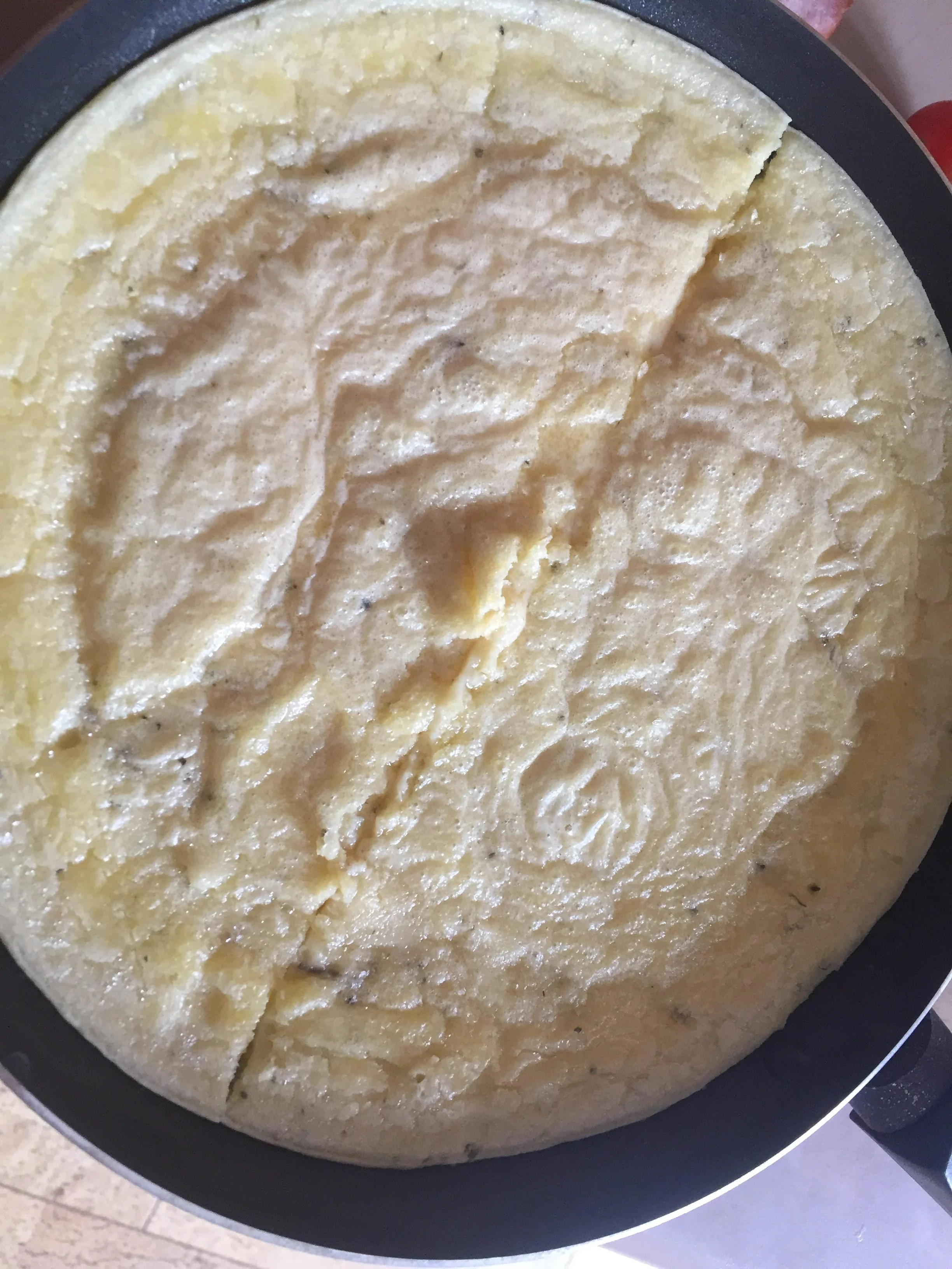 ШАГ 2 Массу перелить в сковороду, смазанную любым растительным маслом или жиром, и поставить на огонь. Как только масса загустеет, поставить в духовку на 5-10 мин. Надо, чтобы омлет поднялся.