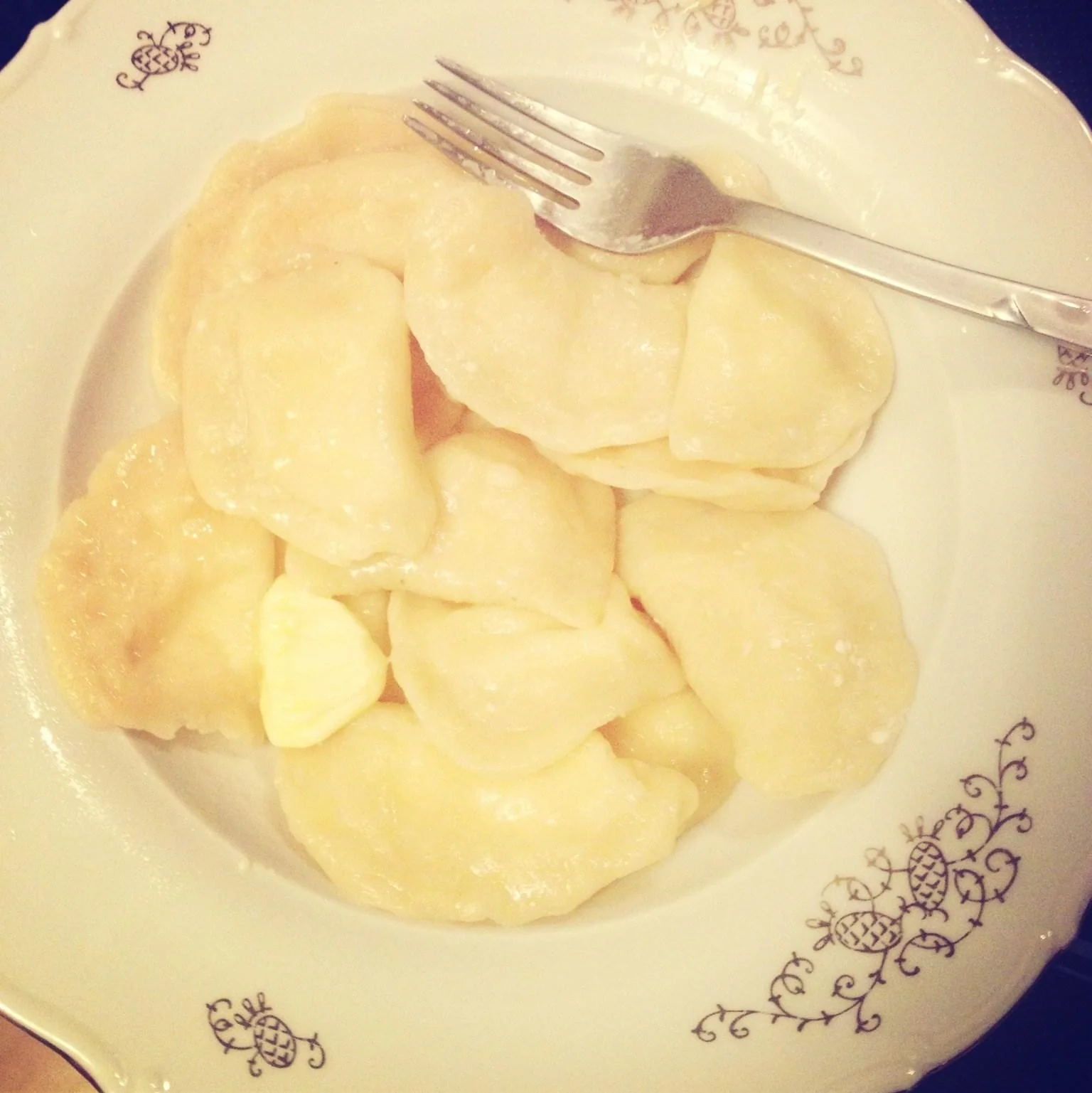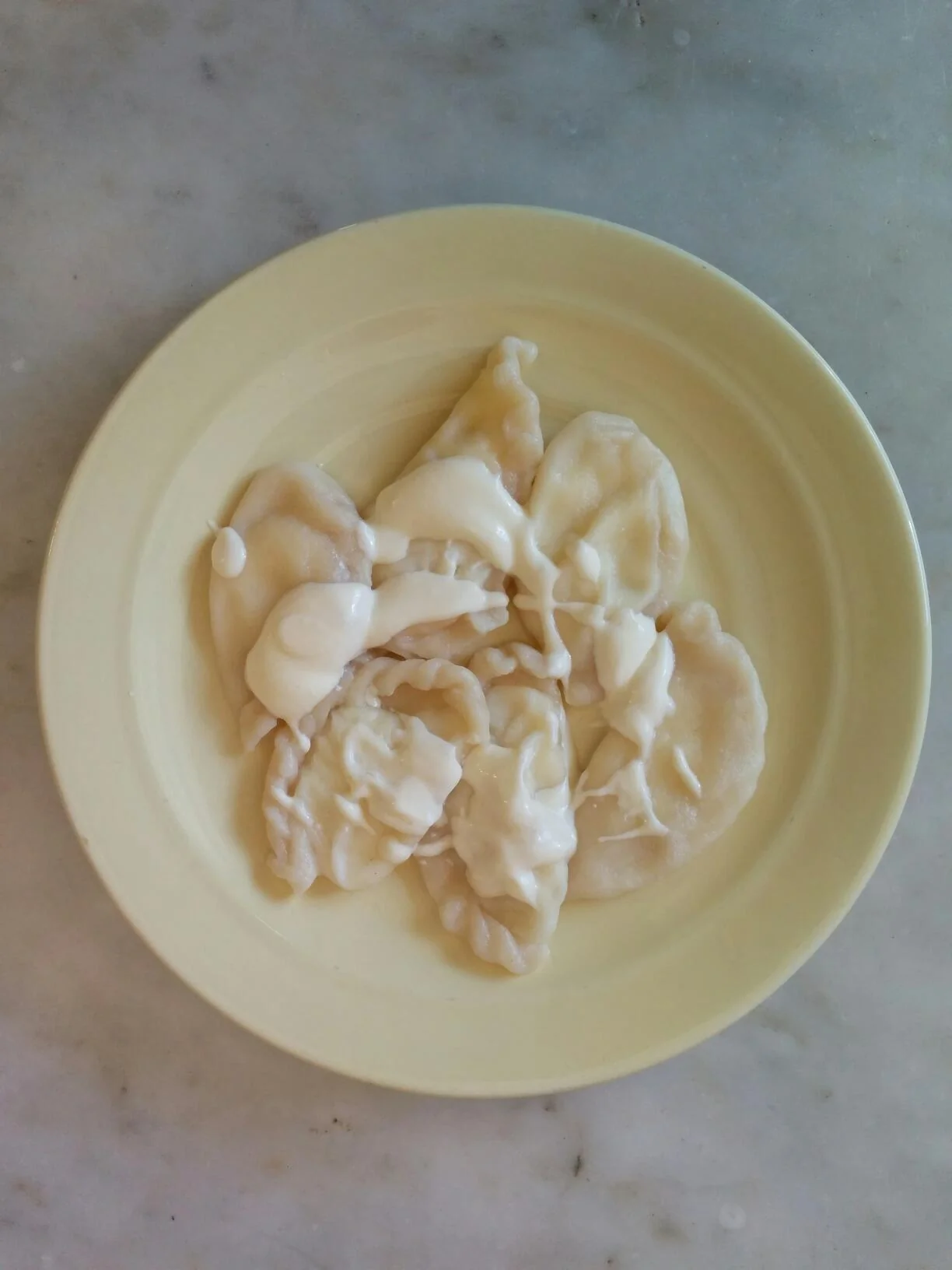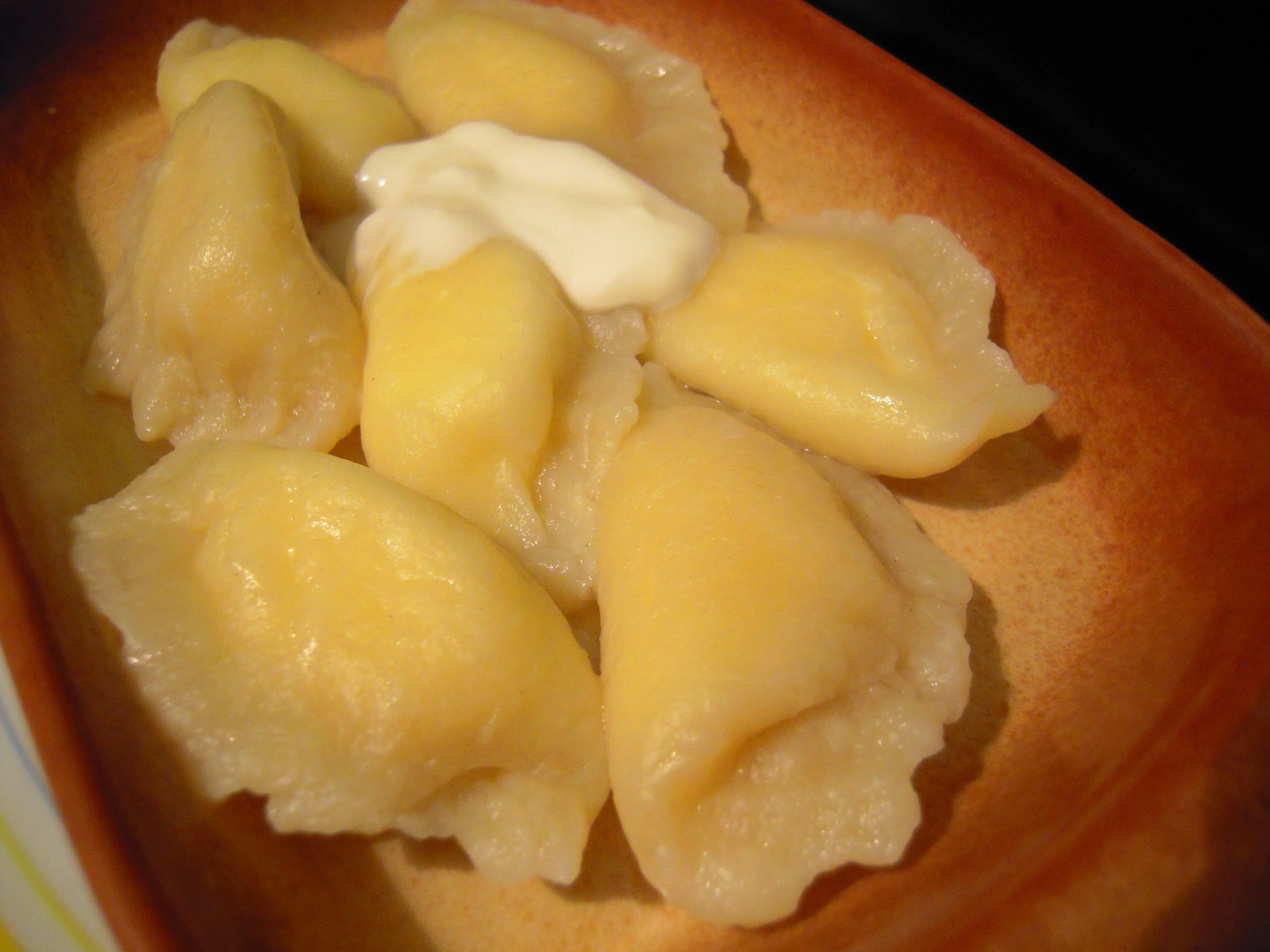 ШАГ 4 За 10 минут до подачи на стол вареники опустить в подсоленный кипяток и варить, пока они не всплывут. Затем вынуть их шумовкой, сложить на блюдо или в салатник, полить растопленным маслом и подавать со сметаной или с фруктовым сиропом.